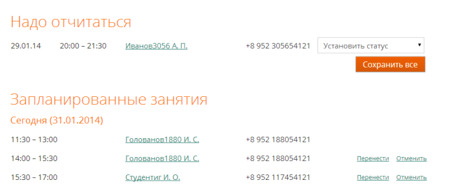 вы всегда видите список предстоящих занятий.А также занятия, о проведении которых надо отчитаться менеджеру.