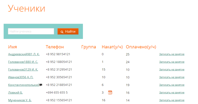 Если ученик давно не посещал занятия, его имя будет отмечено специальным значком.