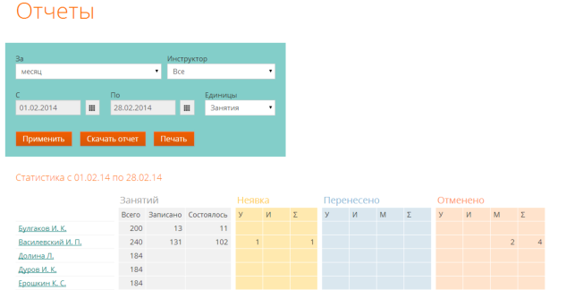 Таблицы отчетов можно формировать за любой период, для всех инструкторов школы или для каждого отдельно.